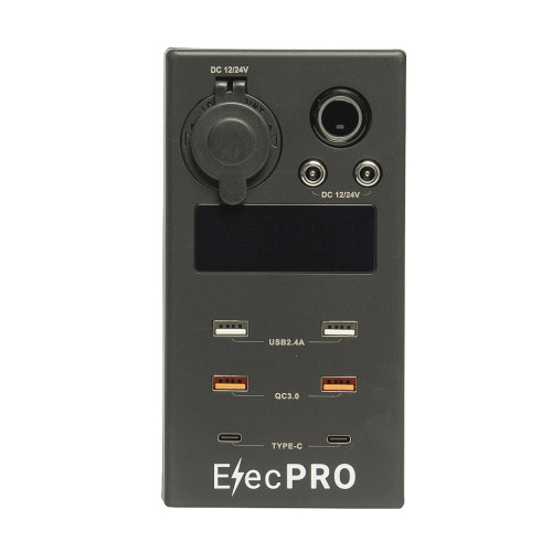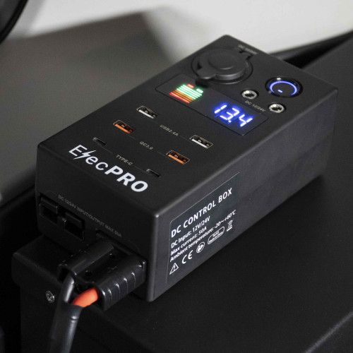 It contains two 50A Anderson-style outlets. One of these is used to connect the power box to the battery, and the other can be used as an output or input, meaning you can use it to either power an appliance with Anderson plug such as fridges, or connect a DC-DC charger or solar panel to charge the connected battery. All of the Anderson outlets are recessed into the body to minimise the possibility of damage from knocks. It also contains two USB ports, two QC3.0 USB ports, two USB Type-C ports, a cigarette port and two DC barrel ports, as well as an inbuilt voltmeter.